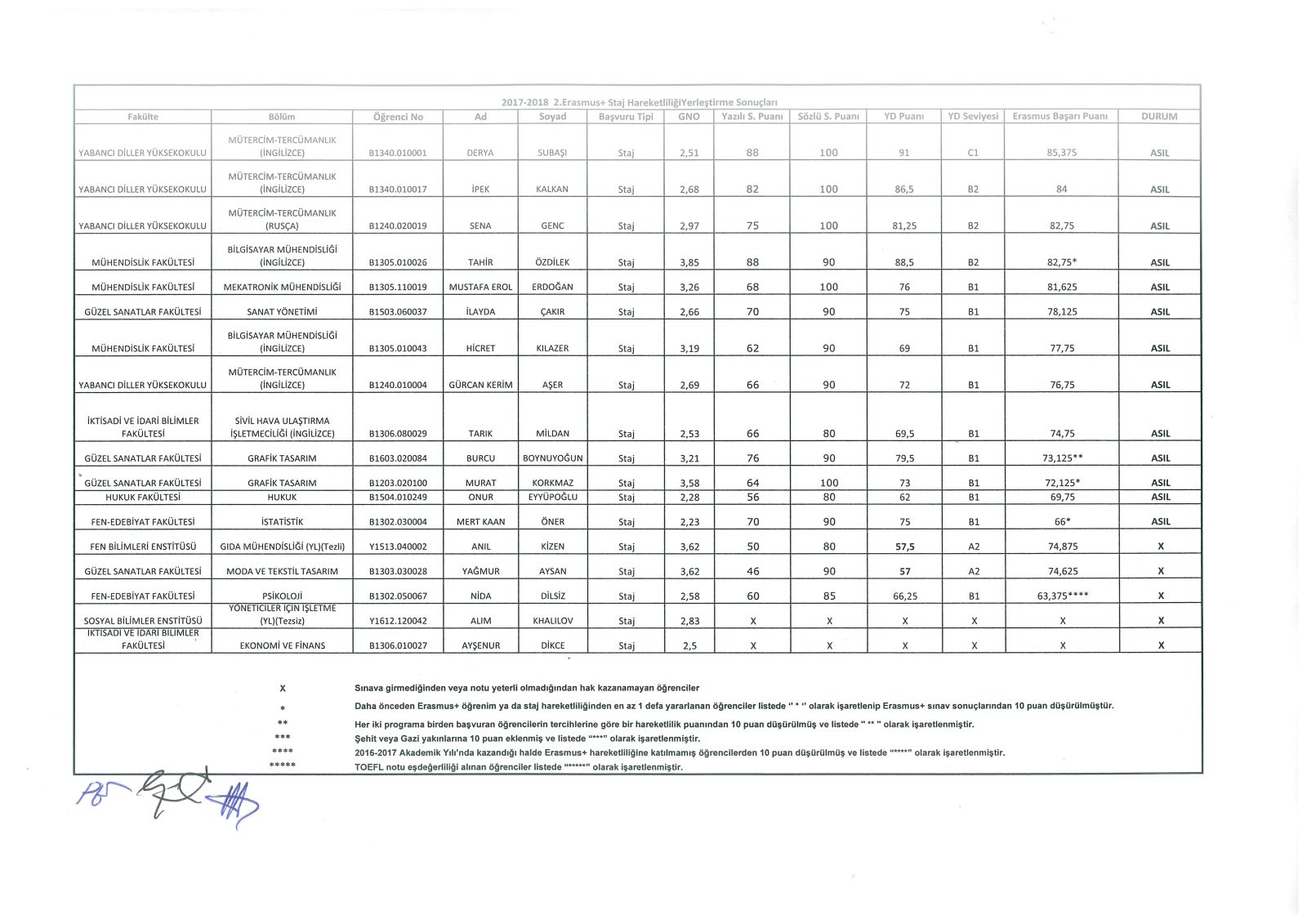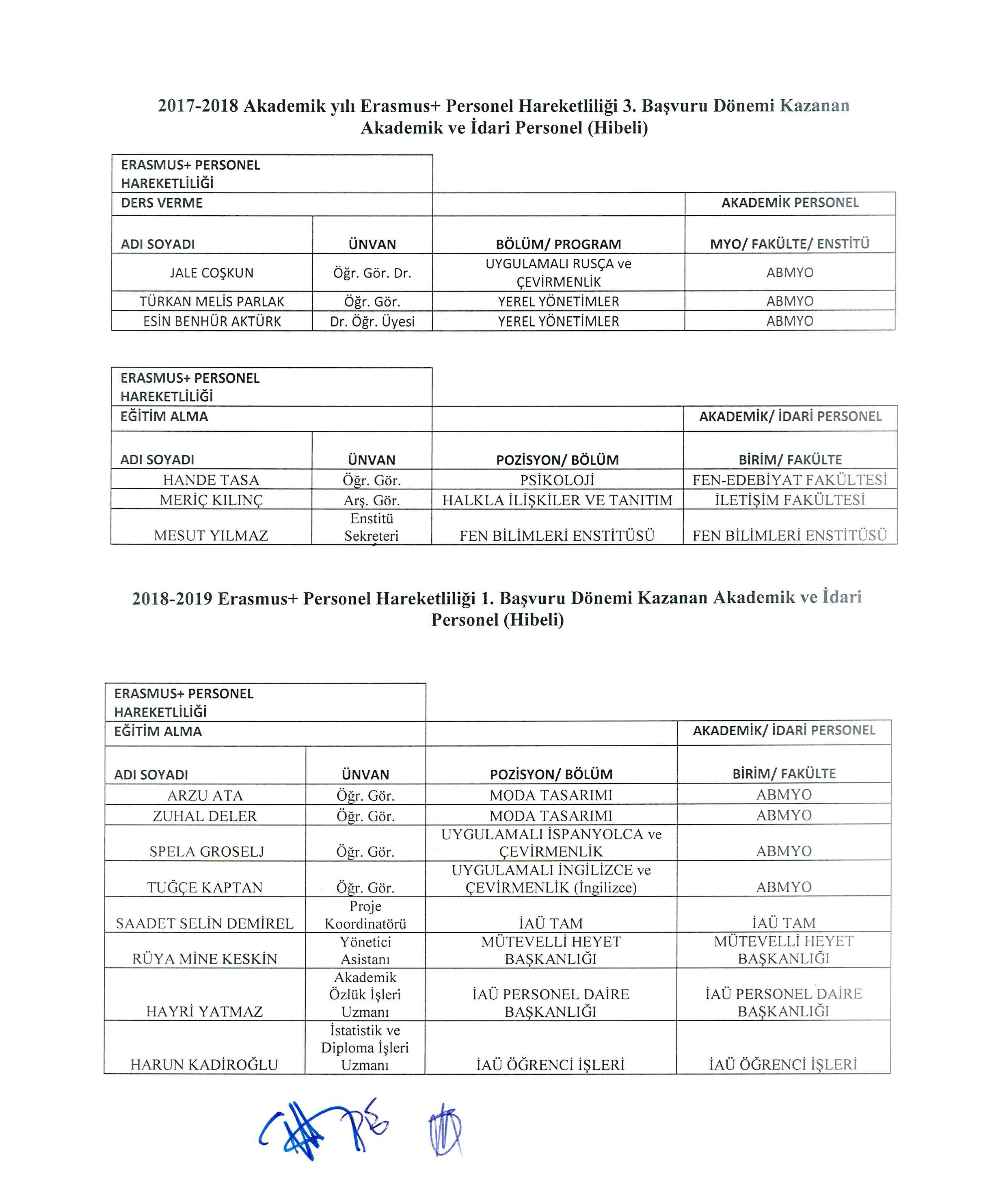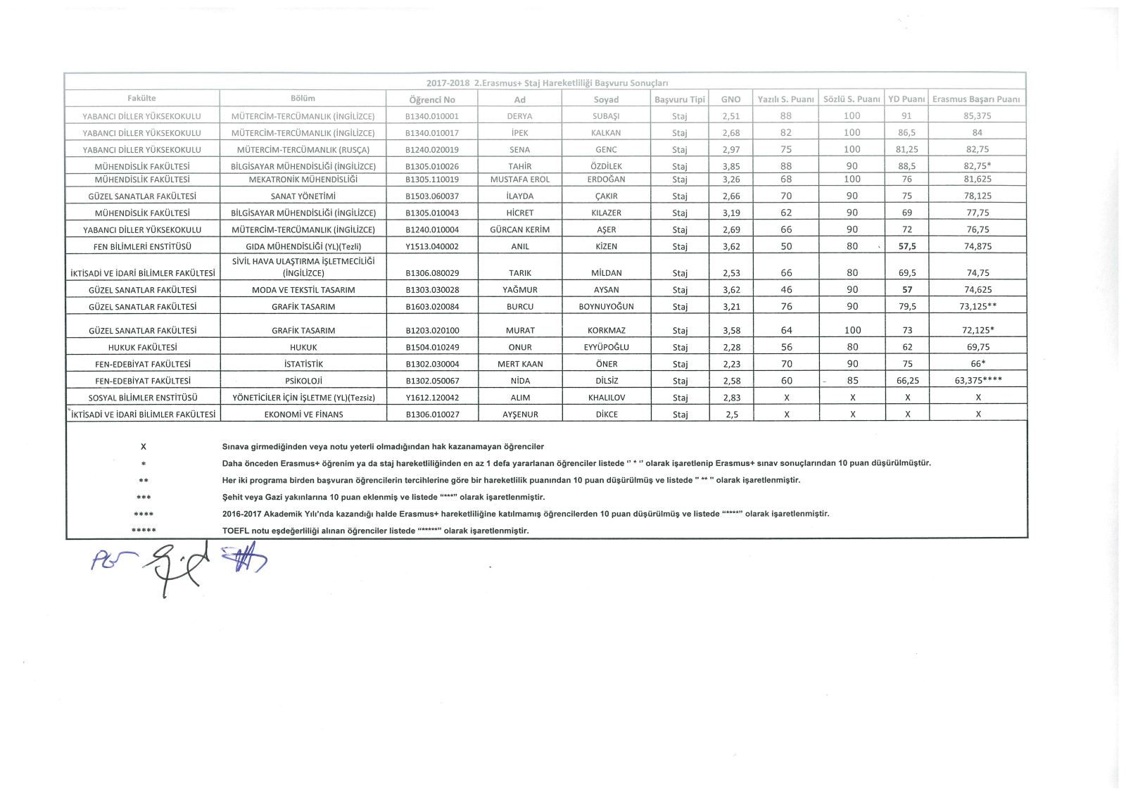 2017-2018 Erasmus+ Öğrenim ve Staj hareketliliği başvuru sonuçları aşağıdaki tablolarda
