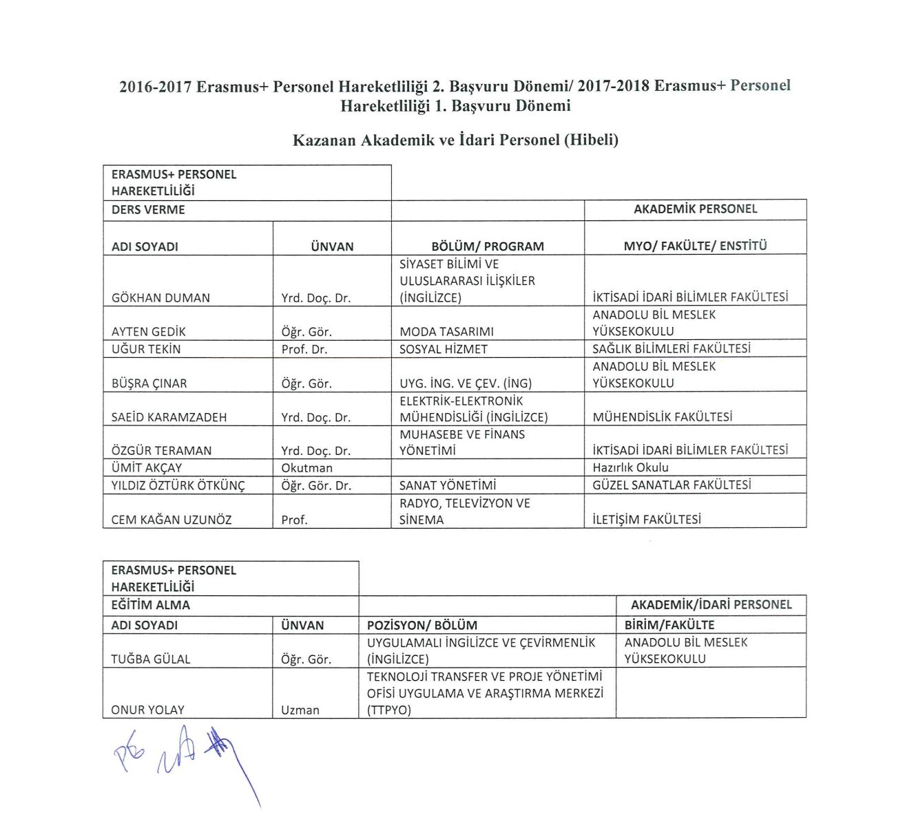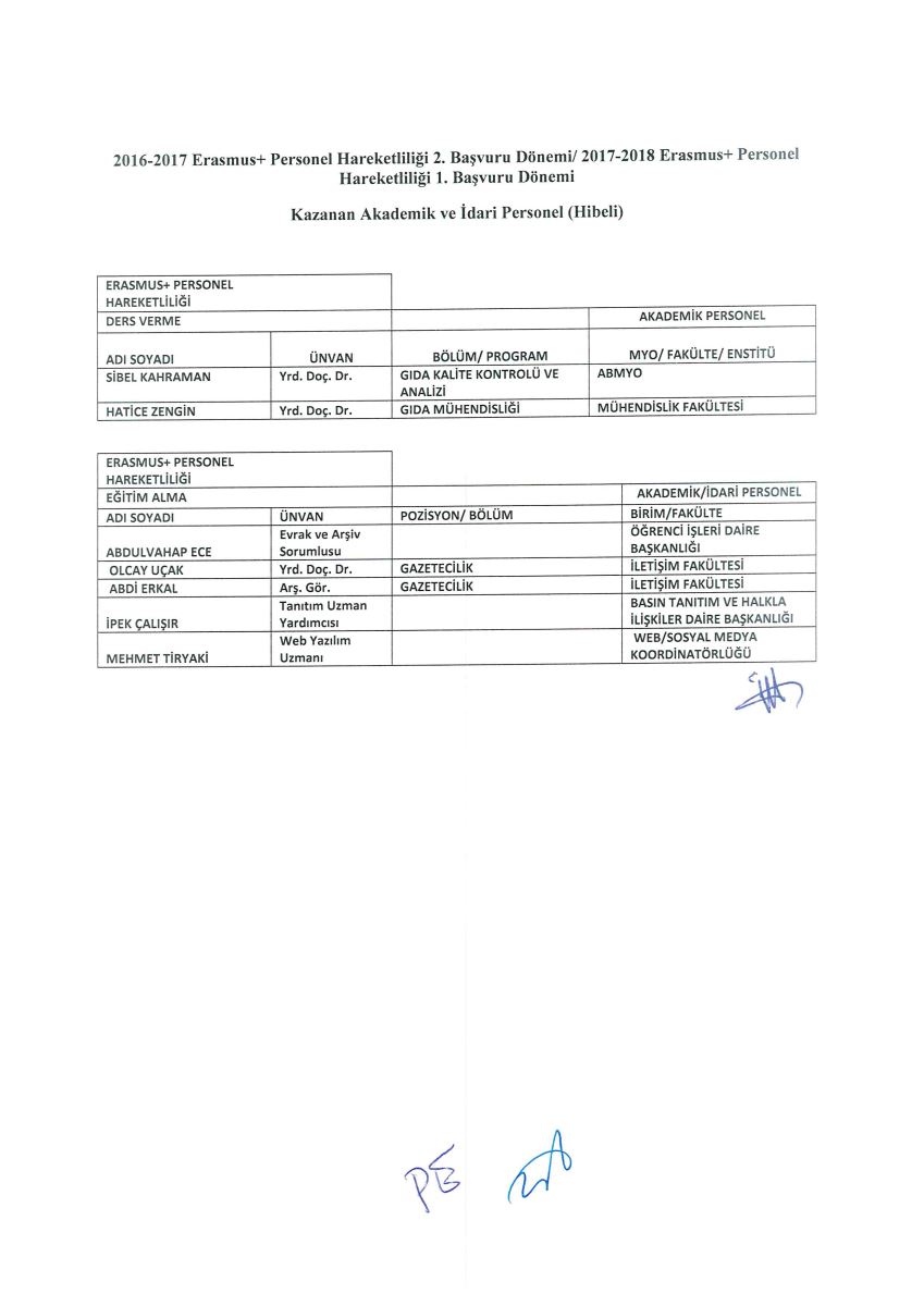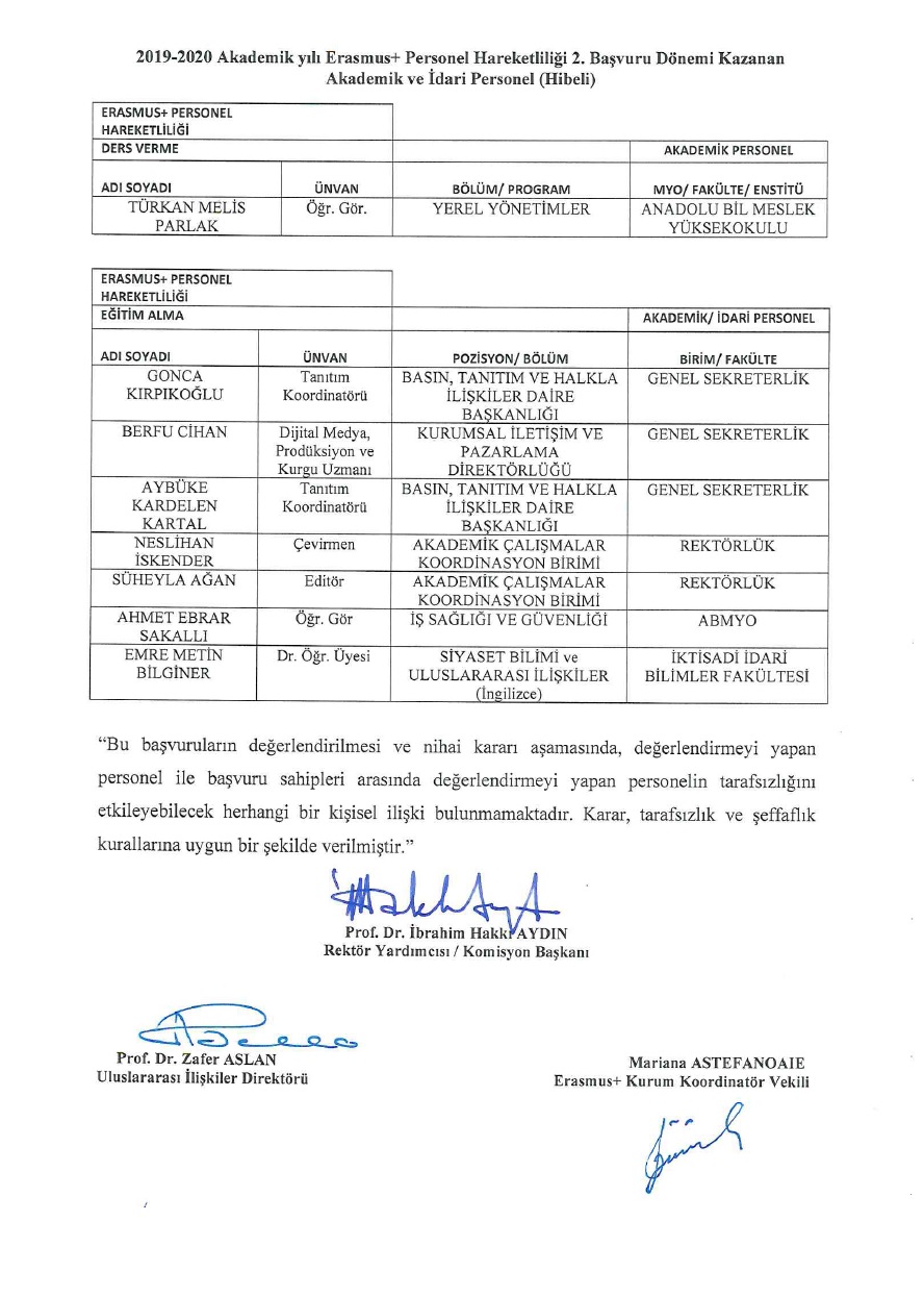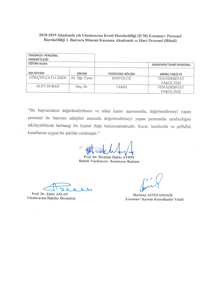 - Tablolarda açıklanan sonuçlar değerlendirme açısından nihai sonuçlardır. Erasmus+ Değişim Programına katılacak olan personelden seçilenlerin, Üniversitemize tahsis edilen hibeden yararlanmaya hak kazanmıştır.