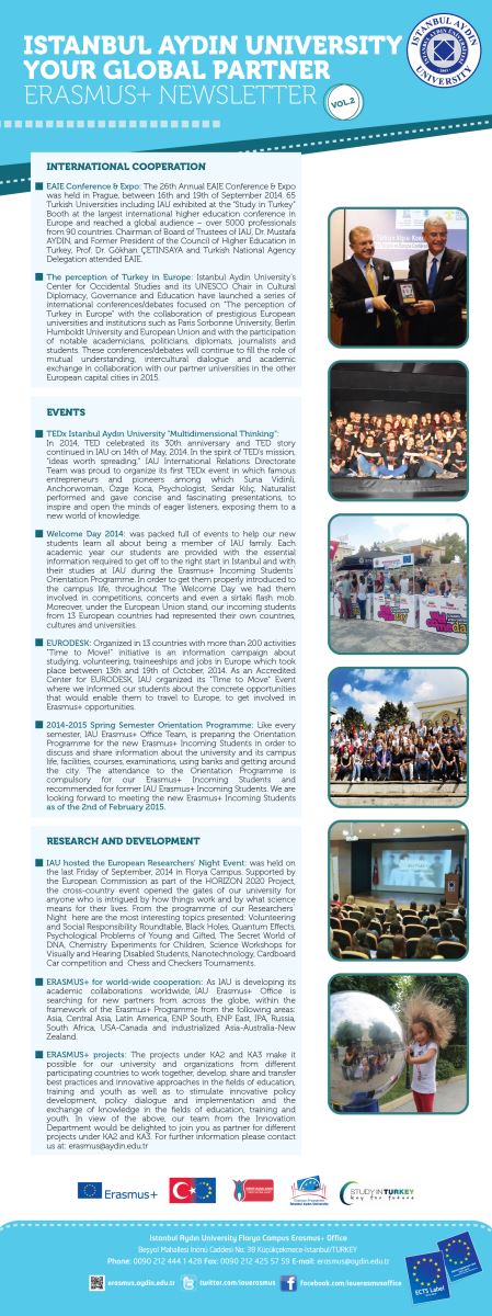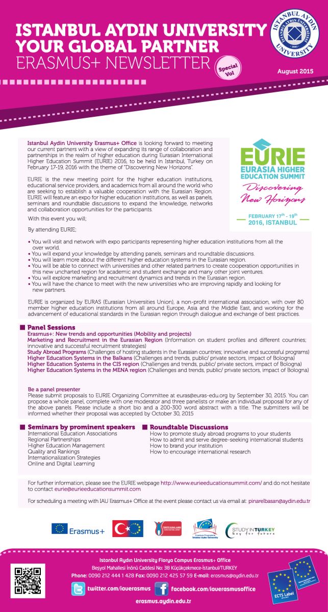 17 Şubat 2016 tarihinde Erasmus+ Kurum Koordinatörlüğü ve Uluslararası Akademik İlişkiler Koordinatörlüğü’nün ortak çalışması ile EURIE – Avrasya Yükseköğretim Zirvesi özel etkinliği kapsamında Üniversitemiz ev sahipliğinde gerçekleşen ‘’Exchange of Experience Meetings on International Short Term Study Programs” etkinliğimize Avrupa’nın önde gelen üniversitesilerinden Athens University of Economics and Business, Romanian American University, St. Cyril and St. Methodius University of Veliko Tarnovo, TEI of Crete, Ecological University of Bucharest, Aristotle University of Thessaloniki, University Campus Suffolk, Griffith College Ireland, BPP University, Zagreb Business School and Ede Christian University of Applied Sciences katılım sağladı.