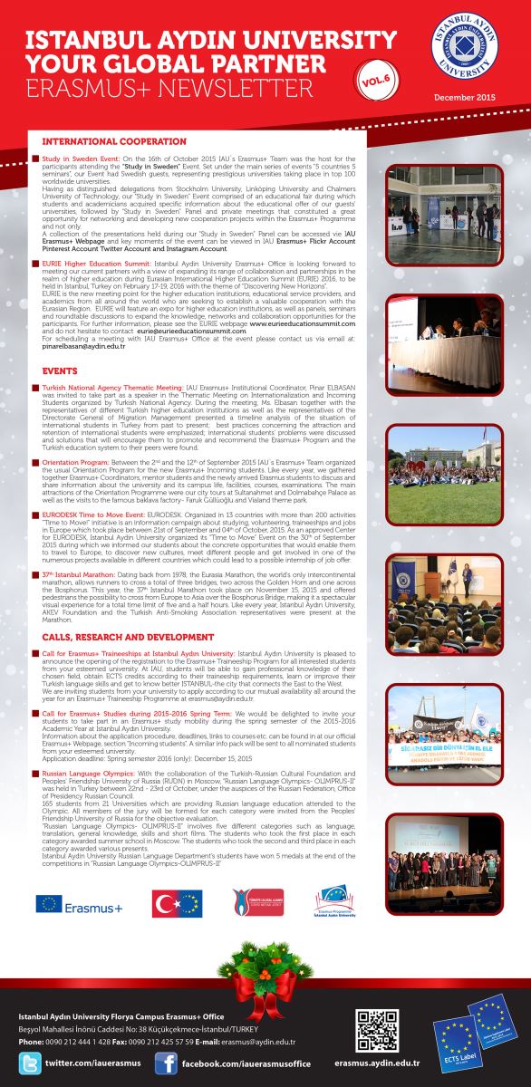 16 Ekim 2015 tarihinde İstanbul Aydın Üniversitesi Erasmus+ Kurum Koordinatörlüğü olarak organize edilen, ‘’ İsveç’te Eğitim’’ Etkinliği Stockholm Üniversitesi, Linköping Üniversitesi ve Chalmers Teknoloji Üniversitesinden gelen delegasyon, öğrencilerimizin ve akademisyenlerimizin İsveç eğitim, değişim programları, burs ve Erasmus+ fırsatları hakkında kesin bilgi alabilmelerini sağladı. Ayrıca ‘’İsveç’te Eğitim’’ panelinden sonra yapılan özel iş birliği toplantı ile Erasmus+ programı dışında da diğer iş birliklerinin kurulabileceğini kanıtlayan bir ortam oluştu.